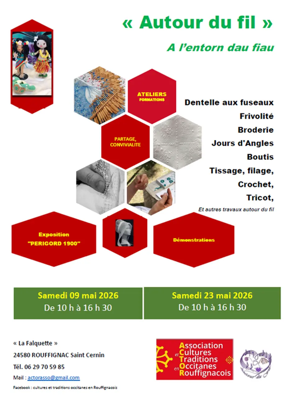 Actor - Autour du filLe 25/04/2026Rouffignac-Saint-Cernin-de-ReilhacDentelle aux fuseaux, frivolité, broderie, jours d’angle, boutis, tissage, filage, crochet, tricot et autres travaux autour du fil.