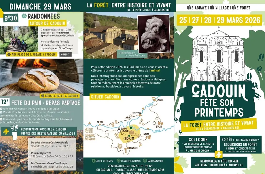 Cadouin fête son printemps | 3ème éditionLe 27/03/2026Le Buisson-de-CadouinLe printemps arrive et, à Cadouin, on a prévu de le célébrer avec quatre jours pour explorer le thème de la forêt, entre histoire et nature vivante.