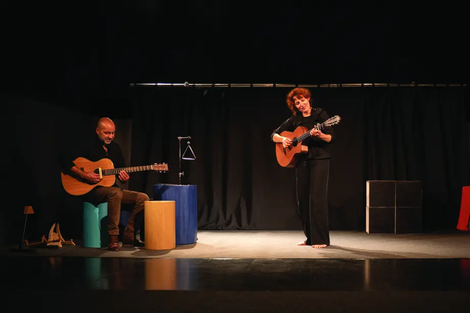 Deux personnages complices, le son des guitares et des voix qui s'entremêlent, des jeux rythmiques, une caisse claire, 4 cubes pour jouer, imaginer, raconter la vie d'un café...