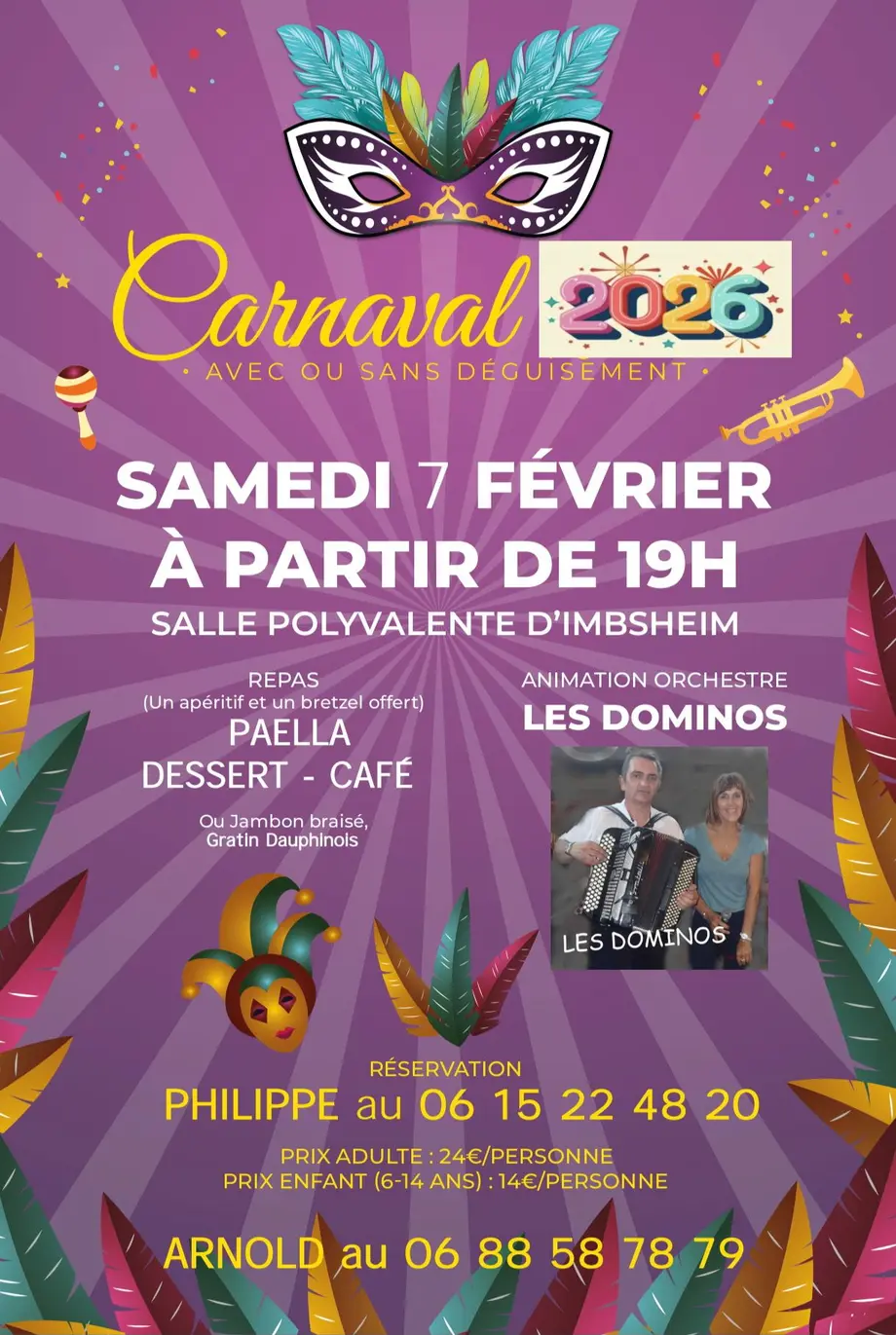 ℹ️ Repas (avec apéritif et bretzel offert) : paëlla-dessert-café ou jambon braisé / gratin dauphinois. Adulte : 24€ et enfant (6-14 ans) : 14€
