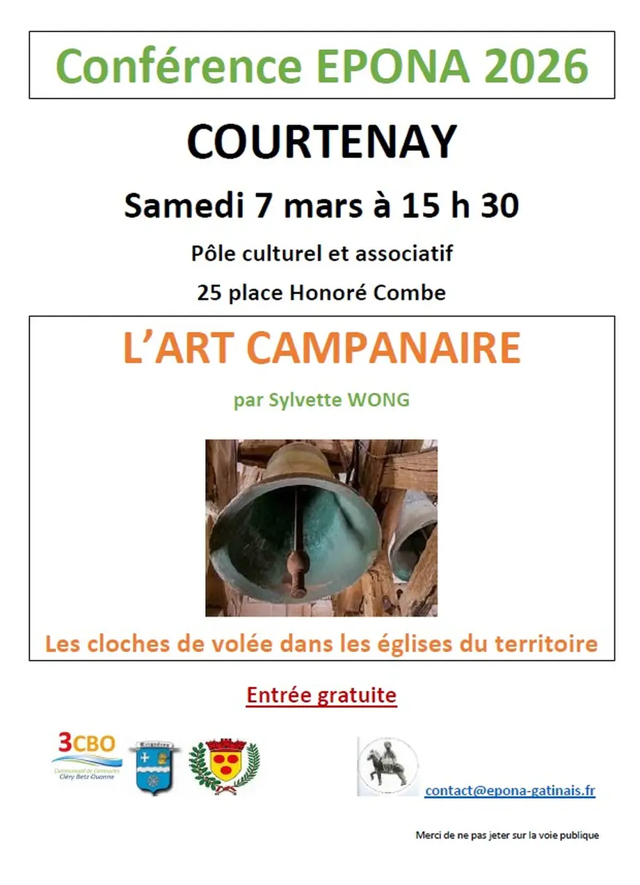 Conférence de l’association EPONA dont le sujet portera sur l’art campanaire : les cloches de volée dans les églises du territoire. Présentée par Sylvette Wong.