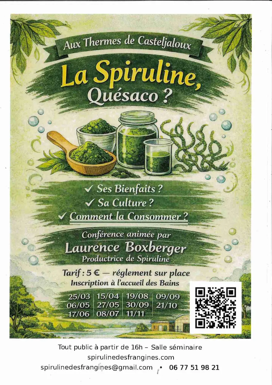 Conférence sur la spirulineLe 15/04/2026CasteljalouxSes bienfaits, sa culture, comment la consommer.
