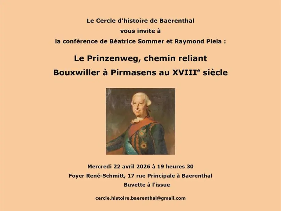 Le Cercle d’histoire de Baerenthal organise une conférence le mercredi 22 avril 2026, à 19 h 30, au foyer René-Schmitt, 17, rue Principale, à Baerenthal. Béatrice Sommer et Raymond Piela présenteront « Le Prinzenweg, chemin reliant Bouxwiller à Pirmasens au XVIIIe siècle ».