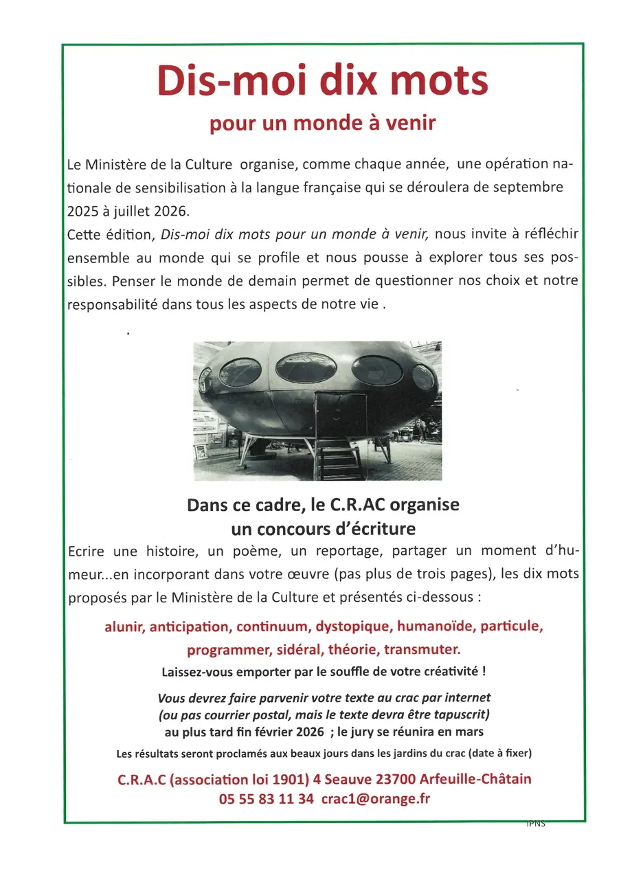Écrire une histoire, un poème, un reportage, ou partager un moment d’humeur, en incorporant dans votre œuvre (pas plus de trois pages) les dix mots proposés par le Ministère de la Culture et présentés ci-dessous :