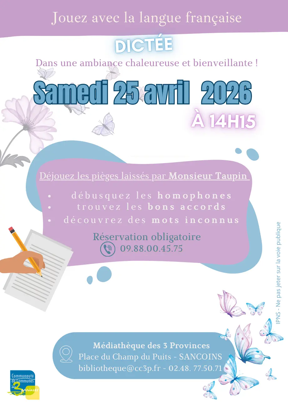 La Médiathèque des 3 Provinces vous invite à une dictée festive et bienveillante le samedi 20 décembre 2025 à 14 h 15.