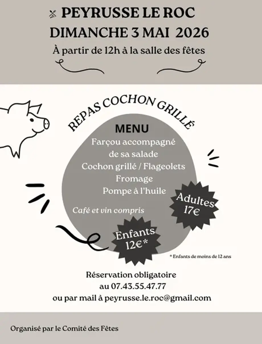 Réservation obligatoire au 07 43 55 47 77 ou par mail à peyrusse.le.roc@gmail.com (Comité des fêtes).