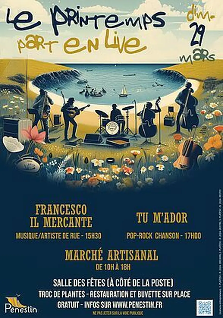 Le festival du Printemps part en live revient à Pénestin le dimanche 29 mars 2026 de 10h00 à 18h00 pour fêter l’arrivée des beaux jours. Au programme trois concerts à ne pas manquer Spectralala (chanson française) à 12h00 puis 15h30 Harvest Folk ( folk-blues) et Tu m’ador (chanson-pop) à 17h00,