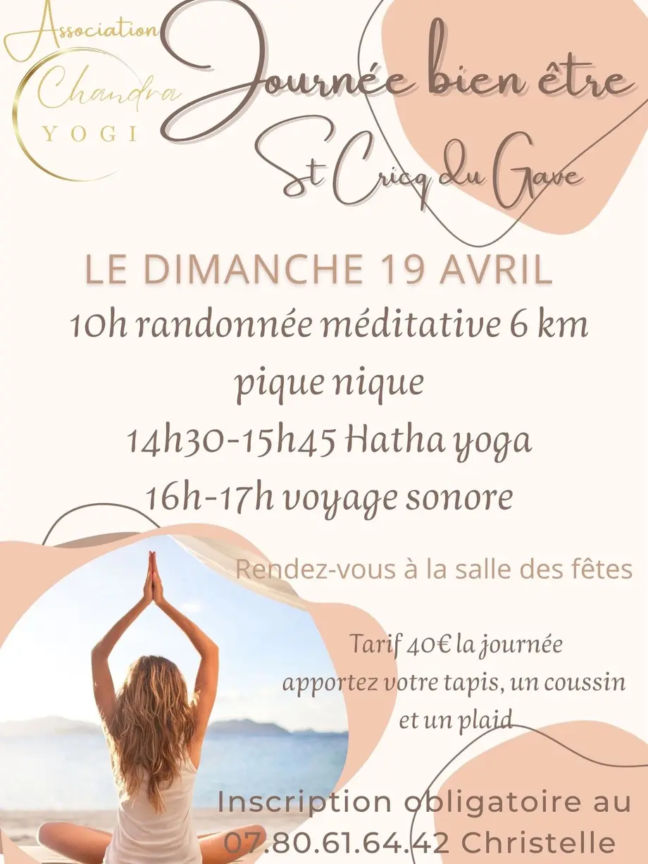 Offrez-vous une parenthèse de sérénité et de reconnexion avec l’Association Chandra Yogi lors d’une journée bien-être à Saint-Cricq-du-Gave, pensée pour apaiser l’esprit et revitaliser le corps. La journée débute à 10 h avec une randonnée méditative de 6 km pour se reconnecter à la nature, suivie d’un moment convivial autour d’un pique-nique. L’après-midi se poursuit de 14 h 30 à 15 h 45 avec une séance de Hatha yoga accessible à tous pour relâcher les tensions et retrouver équilibre et énergie, avant de se laisser porter de 16 h à 17 h par un voyage sonore propice au lâcher-prise et à la détente profonde. Pour clôturer cette journée, un massage sonore sera offert à une personne tirée au sort parmi les participantes et participants, pour prolonger la relaxation.