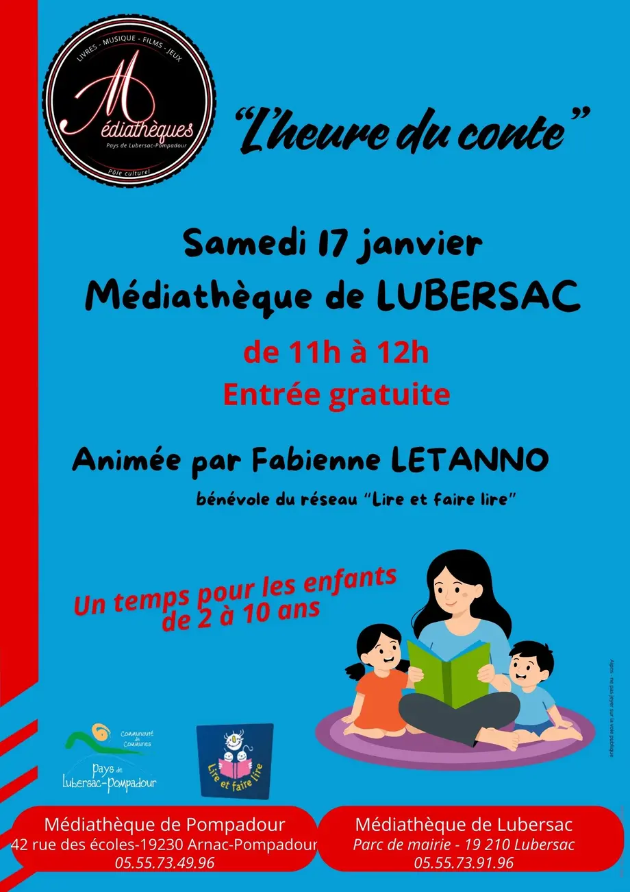 Les médiathèques du Pays de Lubersac-Pompadour organisent une séance de contes. Elle sera animée par Fabienne Letanno, conteuse bénévole, dans le cadre du dispositif « Lire et faire lire ».