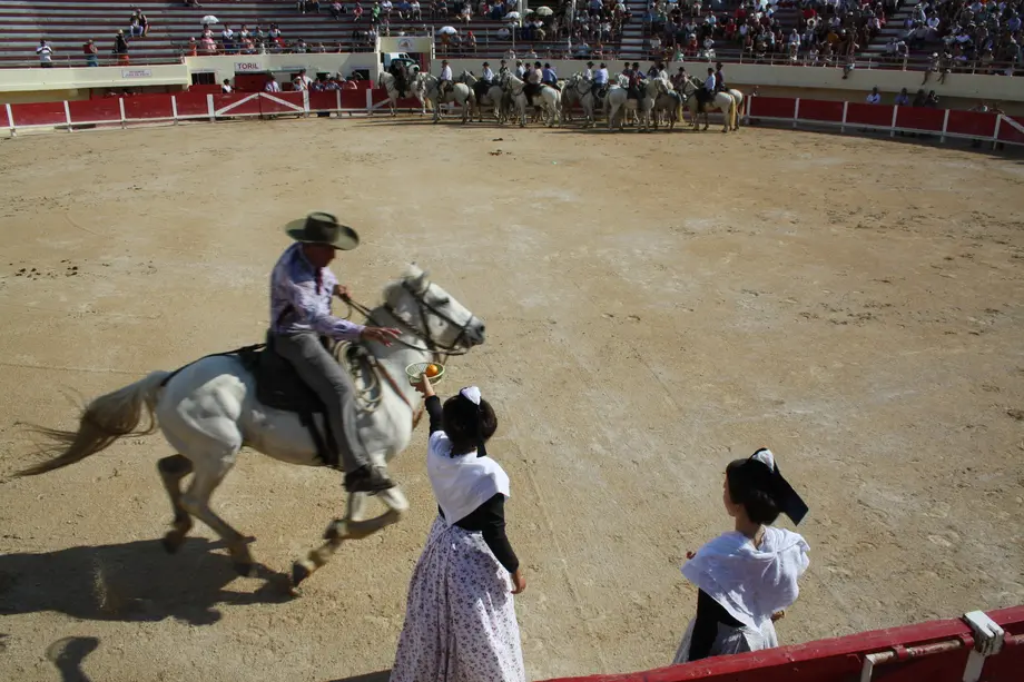 Présentation des cavaliers et des Arlésiennes, saut de cheval à cheval, jeu de l’orange, jeu du bouquet…