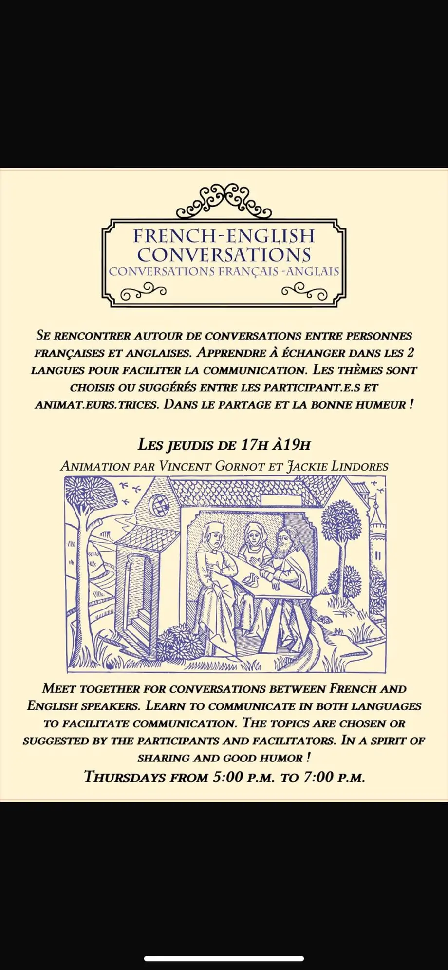 Rendez-vous au Comptoir des échanges, les samedis de 16 h à 18 h, pour des conversations entre personnes françaises et anglaises. Apprenez à échanger dans les deux langues afin de faciliter la communication. Les thèmes sont choisis par les participants et les animateurs, dans un esprit de partage et de bonne humeur.
