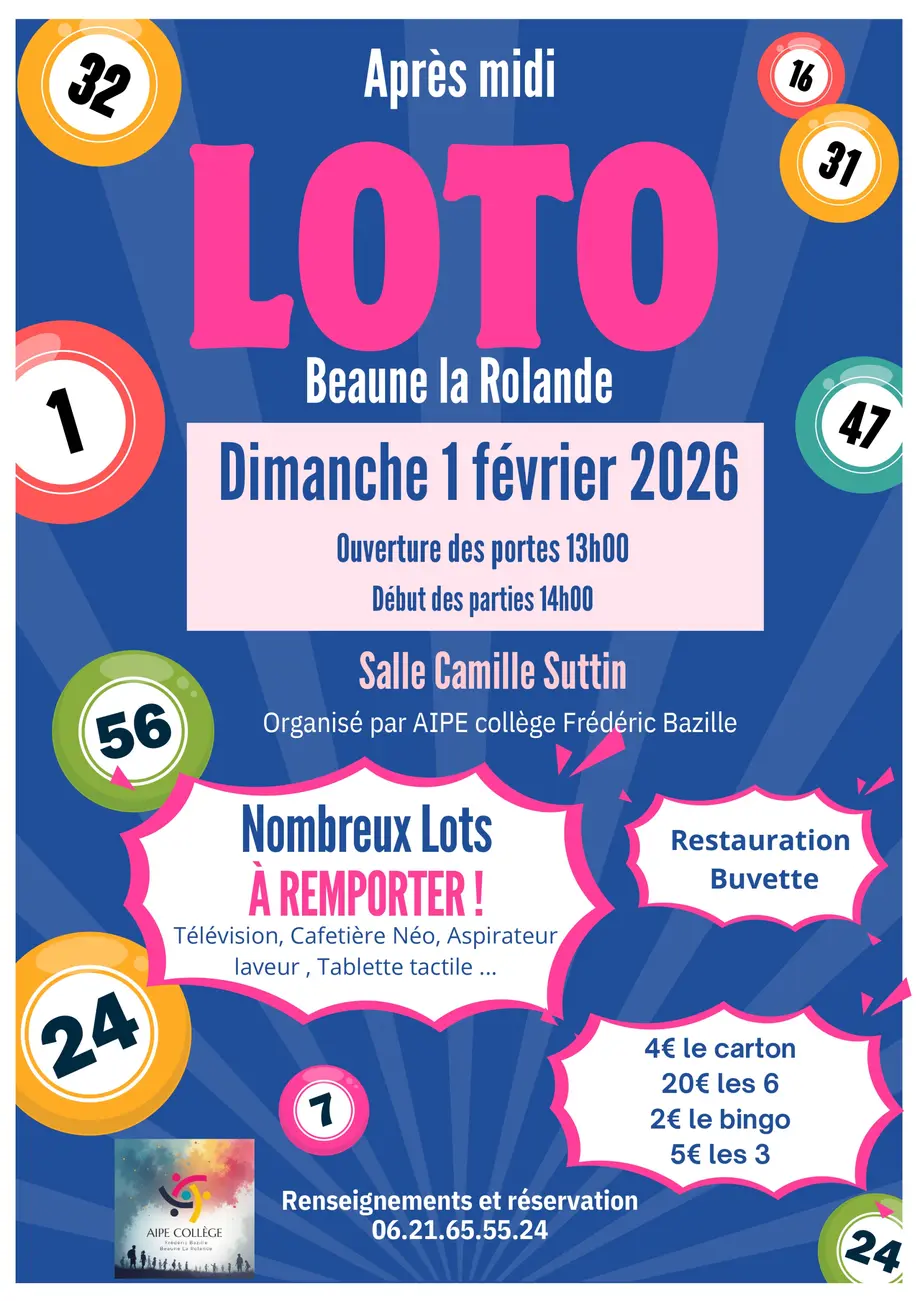 L'association AIPE du collège Frédéric Bazille invite le public à son grand loto annuel le dimanche 1er février 2026, à Beaune-la-Rolande. Cet événement solidaire se déroule à la salle Camille Suttin, avec une ouverture des portes dès 13 h pour permettre l'installation des joueurs avant le début des parties à 14 h.