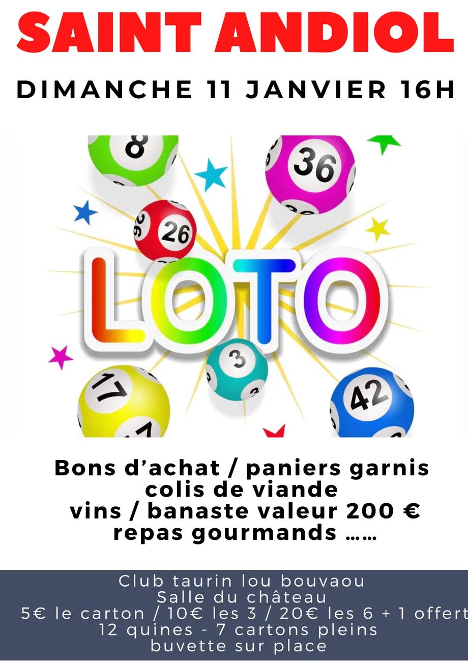Loto du Club Taurin "Lou Bouvaou"Le 15/02/2026 Saint-AndiolLoto du Club Taurin de Saint-Andiol « Lou Bouvaou »