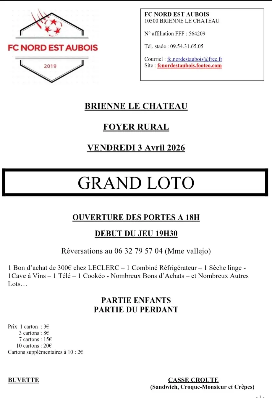 Grand loto du FC Nord Est Aubois à Brienne le château le vendredi 3 Avril 2026 ouverture des portes 18h début des jeux 19h30. Gros lots Bon d'achat de 300 euros et nombreux autres lots. Réservation auprès de Madame Vallejo au 0632795704. Buvette et restauration sur place.