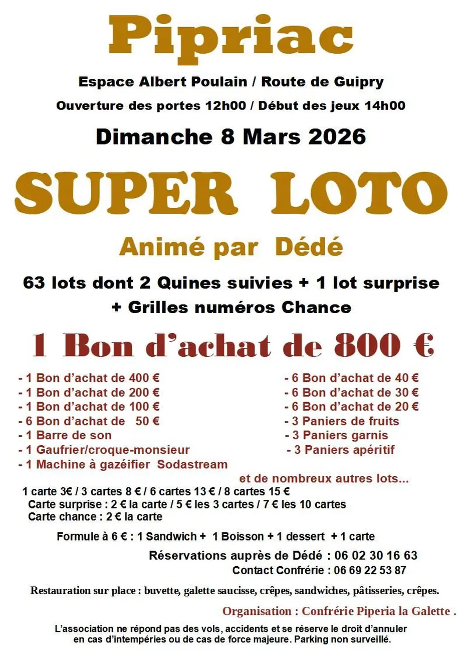 Super LOTO animé par "Dédé" : 63 lots dont 2 Quines suivies + 1 lot surprise + Grilles numéros chance
