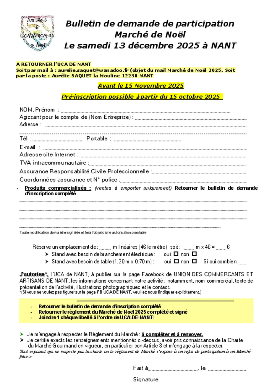 Recherche d’exposants : produits locaux, artisanat et esprit de Noël. Remplissez la fiche ci-dessus. Clôture des inscriptions des exposants : 15/11/2025.