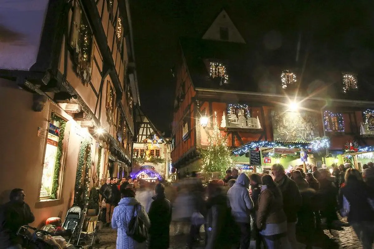 Riquewihr, avec ses rues pavées et ses maisons à colombages, devient un véritable village de conte de fées pendant la période de Noël. Les rues sont parées de guirlandes lumineuses et les façades des maisons sont décorées pour l'occasion. ✨