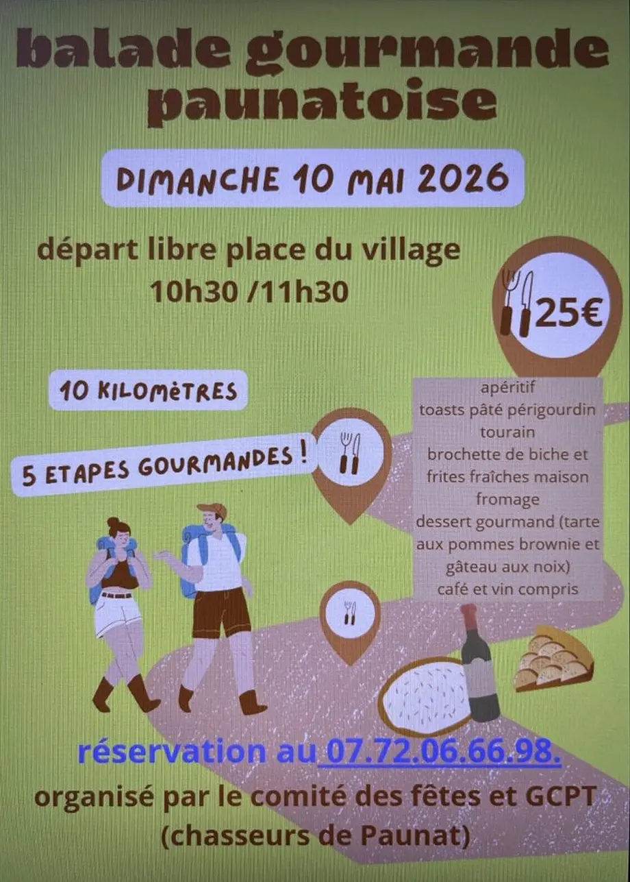 Le comité des fêtes et le GCPT (Groupement des Chasseurs de Paunat) vous donnent rendez-vous pour une journée conviviale et gourmande dimanche 10 mai 2026.