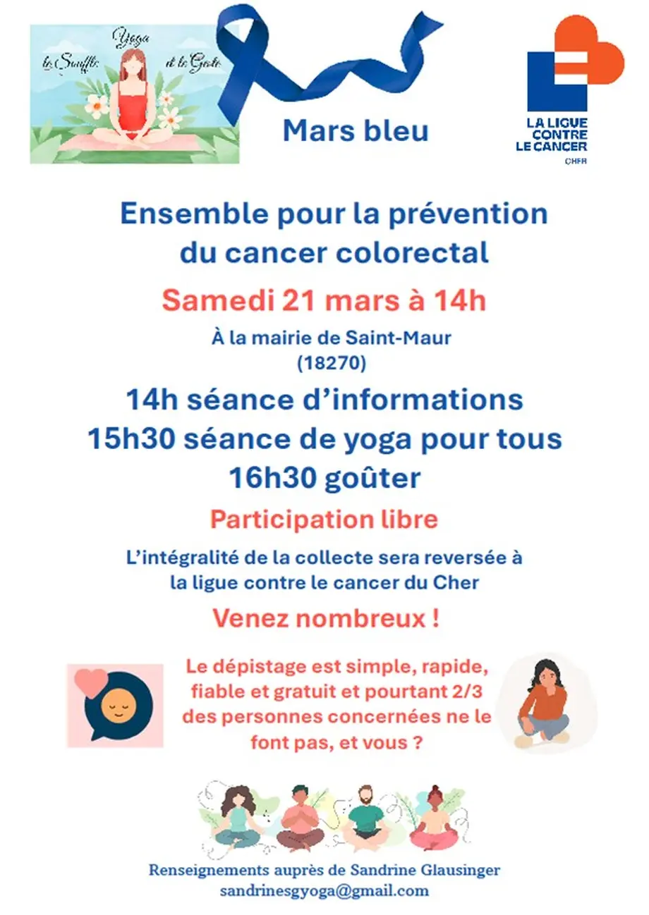 L'association de yoga Le Souffle et le Geste organise une manifestation dans le cadre de Mars Bleu au profit de la Ligue contre le cancer.