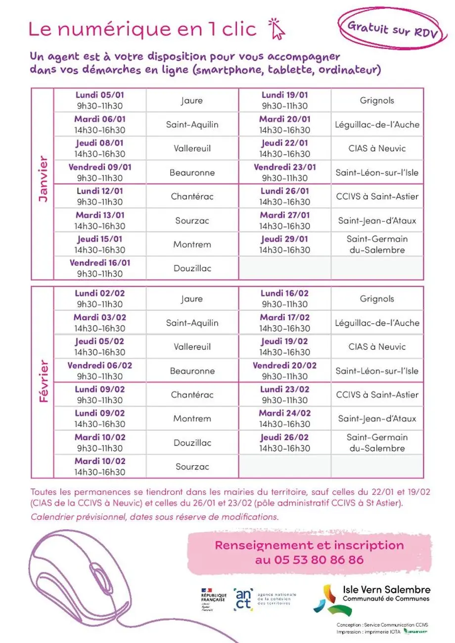 Permanence numériqueLe 19/01/2026 GrignolsBesoin d’un coup de pouce pour vos démarches en ligne ou pour mieux utiliser votre smartphone, tablette ou ordinateur ? Un agent dédié sera là pour vous accompagner pas […]