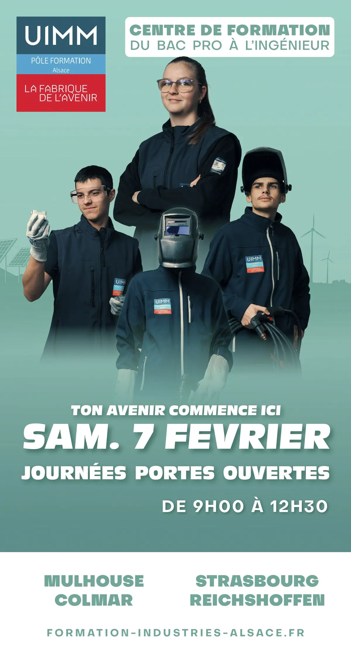 Le Pôle Formation UIMM Alsace vous invite à découvrir ses formations dans le domaine de l'industrie lors des portes ouvertes. Rendez-vous le samedi 22 novembre 2025 à Mulhouse, Colmar, Strasbourg et Reichshoffen pour en savoir plus sur les métiers de l'industrie.