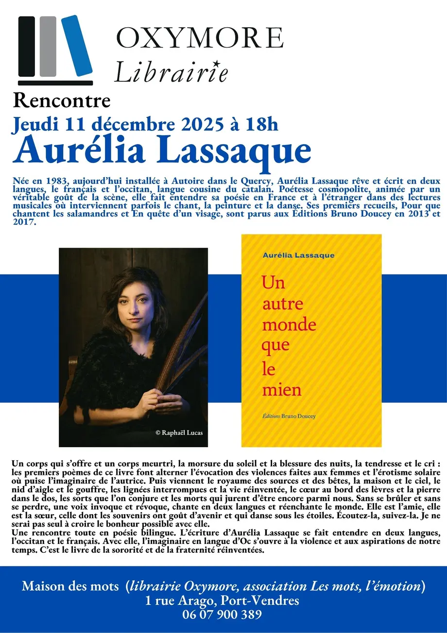 Rencontre Littéraire Hélène LegraisLe 10/12/2025 Port-VendresLa Maison des mots, Ass. Les mots, l'émotion, Librairie Oxymore accueillent Hélène Legrais lors d'une rencontre littéraire.