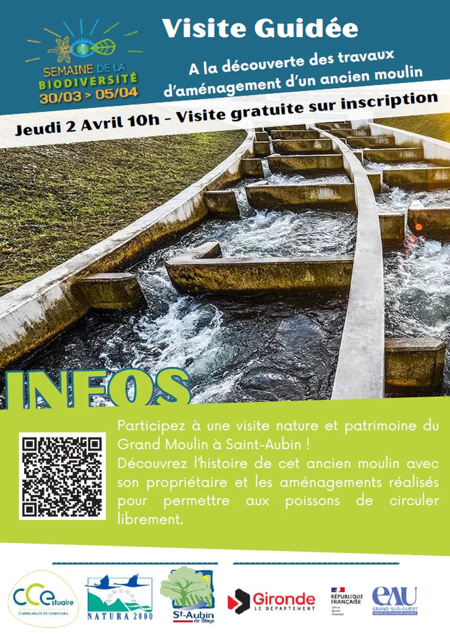 Participez à une visite nature et patrimoine du Grand Moulin de Saint-Aubin ! Découvrez l’histoire de cet ancien moulin avec son propriétaire et les aménagements réalisés pour permettre aux poissons de circuler librement.