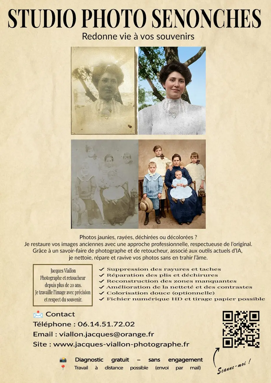 Pour redonner vie à vos souvenirs, photos jaunies, rayées, déchirées ou décolorées. Restauration d'images anciennes avec une approche professionnelle respectueuse de l'original. N'hésitez pas à rencontrer Jacques pour plus de renseignements.