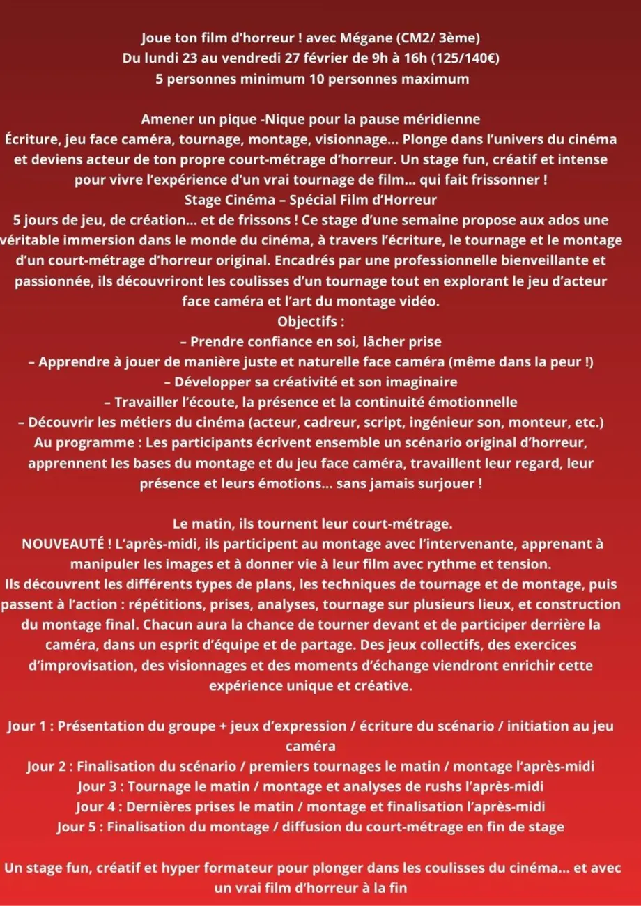 Encadrés par une professionnelle, ils découvrent les métiers du cinéma et expérimentent le travail d’acteur et de technicien dans un cadre ludique et créatif.