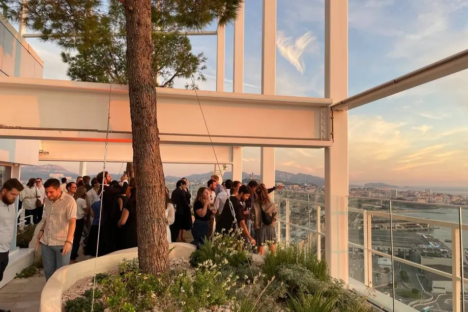 Un groupe de personnes socialisant sur une terrasse avec un arbre et une vue de la ville en arrière-plan.