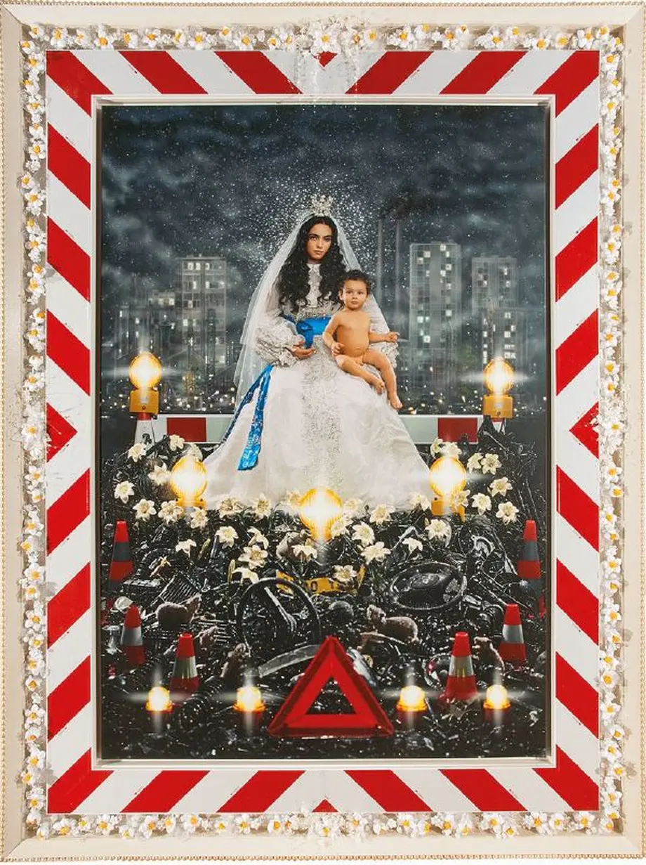 © ©Pierre et Gilles, La Vierge à l’enfant, Hafsia Herzi et Loric, 2009 Installation à l’église Sainte Eustache, dans le cadre de « La force de l’art », Paris, avril 2009 Format sans cadre : 200 x 134 cm ; Format avec cadre : 260,5 x 194,5 cm Collection Pierre et Gilles