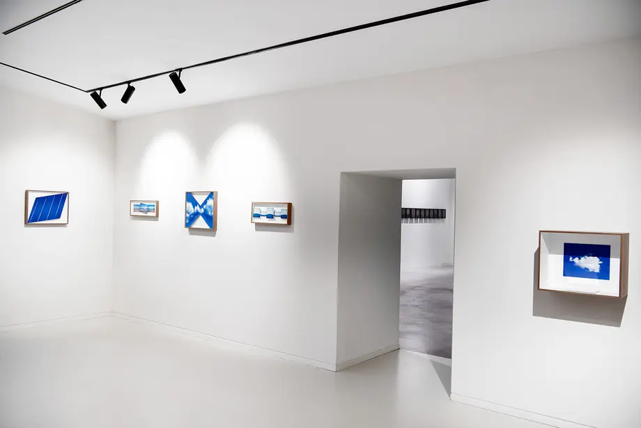 Les formes géométriques minimalistes créent ainsi un dialogue riche : les installations au sol répondent aux surfaces tendues ; les sphères réfléchissantes rencontrent les photographies abstraites ; les tissus colorés répondent aux lignes des peintures.