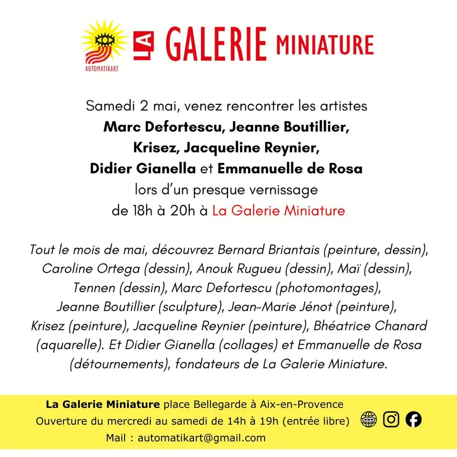 A l'occasion de sa nouvelle exposition "Mai... enfin !", La Galerie Miniature organise son presque vernissage mensuel samedi 2 mai dès 18h. L'occasion de rencontrer une partie des artistes exposants : Marc Defortescu, Jeanne Boutillier, Krisez, Jacqueline Reynier, Emmanuelle de Rosa, Didier Gianella, mais aussi de découvrir cette galerie associative et alternative unique à Aix-en-Provence, ainsi que les travaux des autres artistes : Bernard Briantais, Tennen, Anouk Rugueu, Caroline Ortega, Jean-Marie Jénot, Bhéatrice Chanard, Maï.