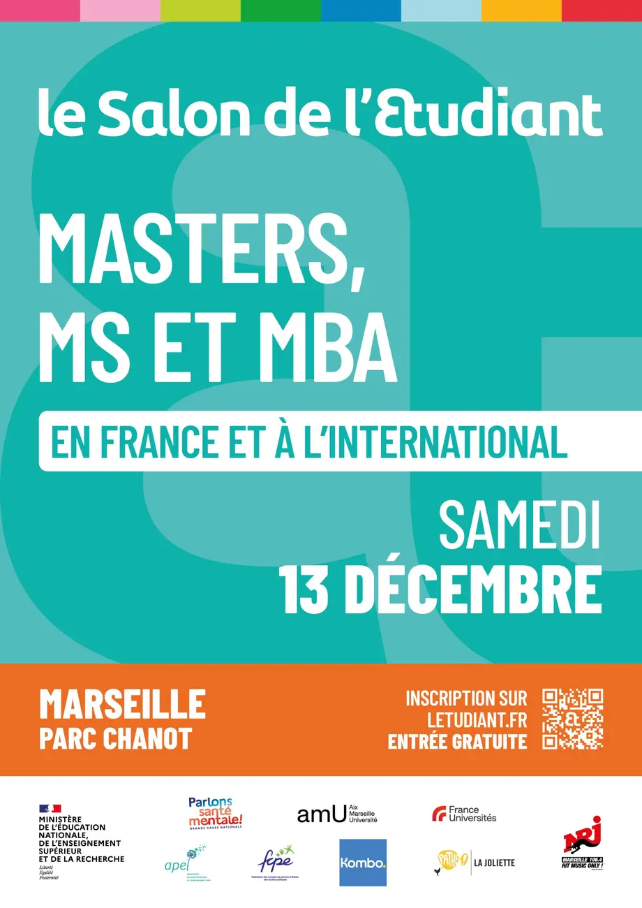 Le Salon masters, mastères spécialisés et MBA en France et à l’international à Marseille ouvrira ses portes pour sa 1ère édition le samedi 13 décembre 2025 au Parc Chanot ! Véritable lieu d’échanges et de découvertes, cet événement incontournable de l’enseignement supérieur est organisé en partenariat le Ministère de l’Éducation nationale, de l’Enseignement Supérieur et de la Recherche. Partageant la mission commune d’accompagner les jeunes vers une orientation réussie, nous serions heureux de pouvoir compter sur votre soutien pour partager cet événement auprès des jeunes et de leur famille.