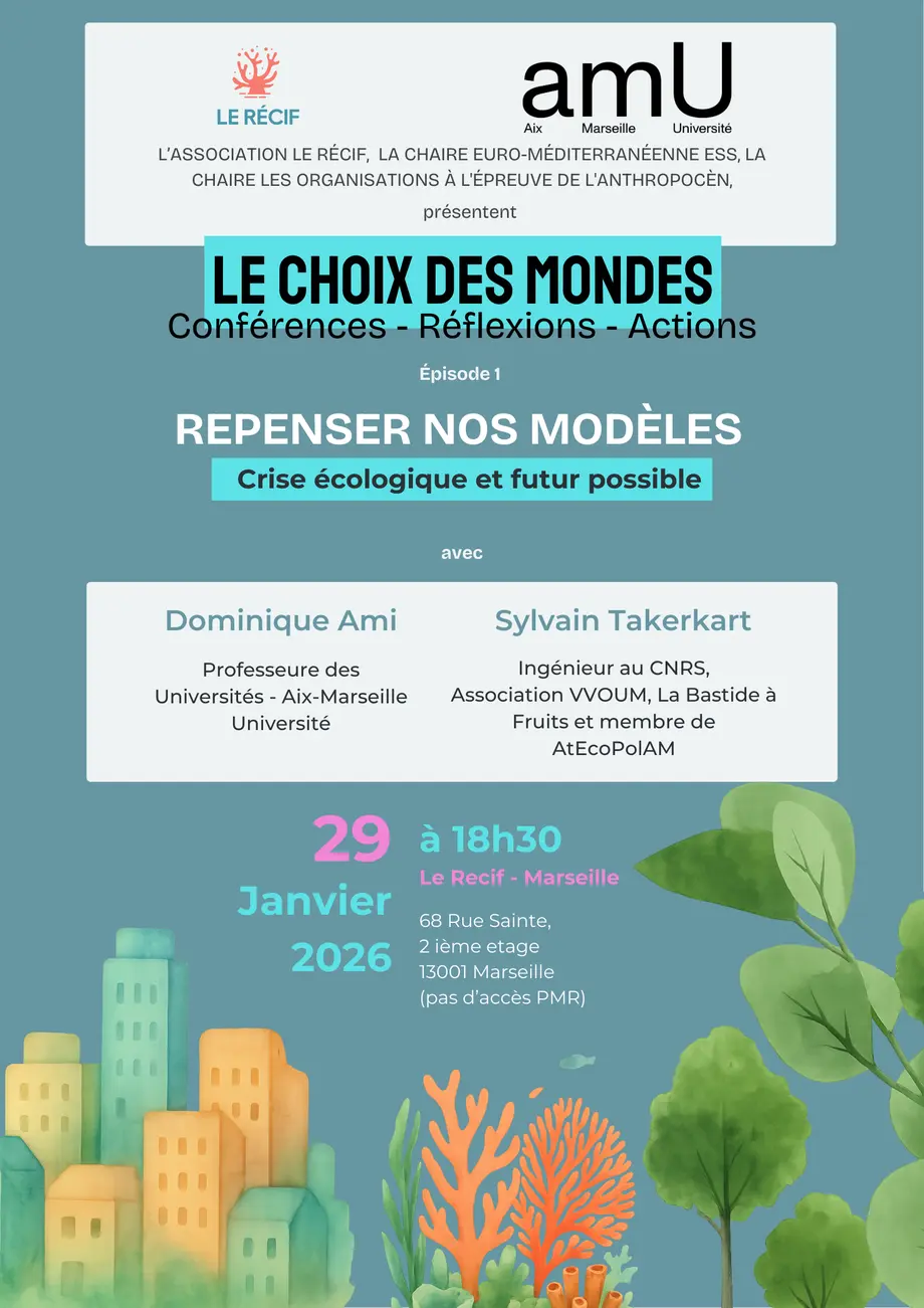 Rencontre sur la crise écologique réunissant des chercheurs et des citoyens. Dominique Ami et Sylvain Takerkart présentent des expériences montrant que des modèles économiques alternatifs existent et permettent une transition réaliste vers une société plus juste.