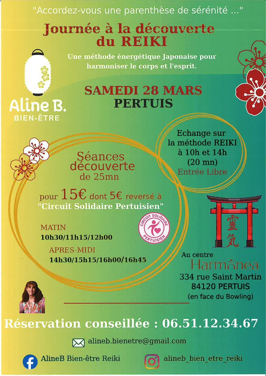 Réservation conseillée : 06 51 12 34 67 / alineb.bienetre@gmail.com