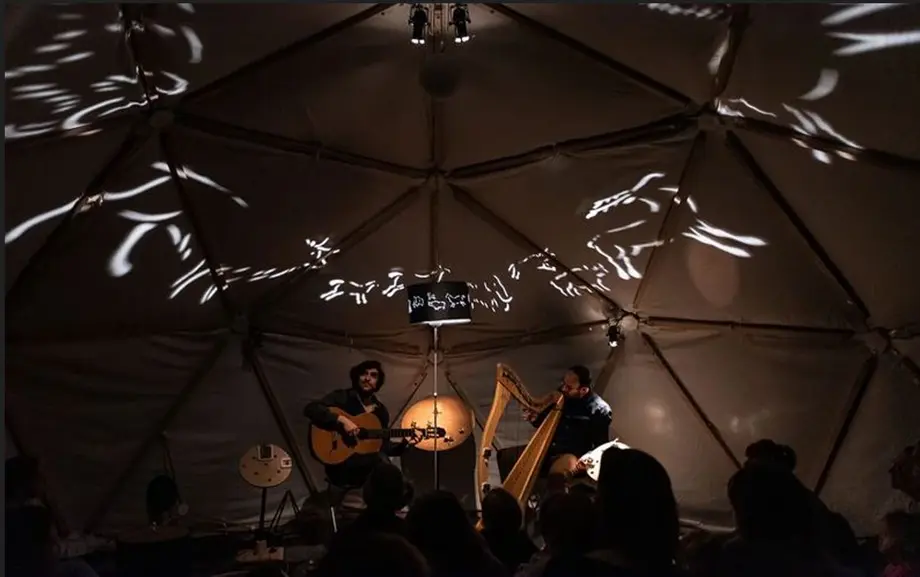 Dans une géode, une harpe et une guitare, accompagnées d’une vingtaine de boîtes à musique, vous proposent un voyage imaginaire jusqu’aux étoiles…