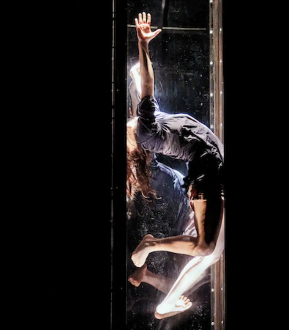 Dans une boîte en Plexiglass, l’artiste semble emprisonnée. Inlassablement, elle monte et descend, écrasant son corps contre la surface transparente. Au gré d’ascensions et parfois de lévitations, elle lutte.