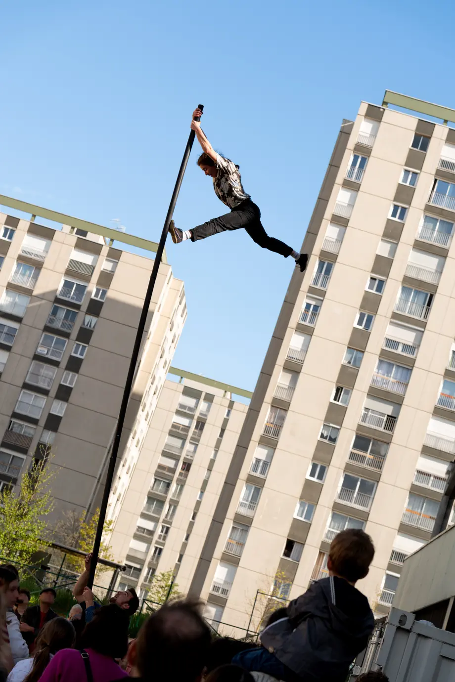 Une proposition artistique et acrobatique qui émerge au milieu d’un marché, d’un quartier, d’une foule. Elle invite à s’arrêter, à se rencontrer autour d’un agrès atypique, la perche, en déséquilibre permanent, et à voir notre ville autrement.