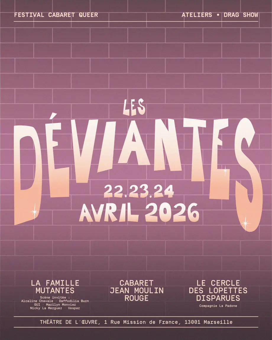 Le festival Les Déviantes revient en 2026 pour sa deuxième édition. Venez vivre les derniers instants du Théâtre de l’Œuvre avant sa transformation : trois jours de cabaret queer pour construire, déconstruire et sabler les planches comme jamais ! Le chantier est ouvert : Bibines pour se désaltérer, Truelles pour manipuler l’imaginaire, Paillettes pour coller aux murs de la scène et aux cœurs. Ici, tout est permis ; tout peut basculer, et chaque performance est un mur à abattre, un plafond à franchir, une étincelle à allumer.