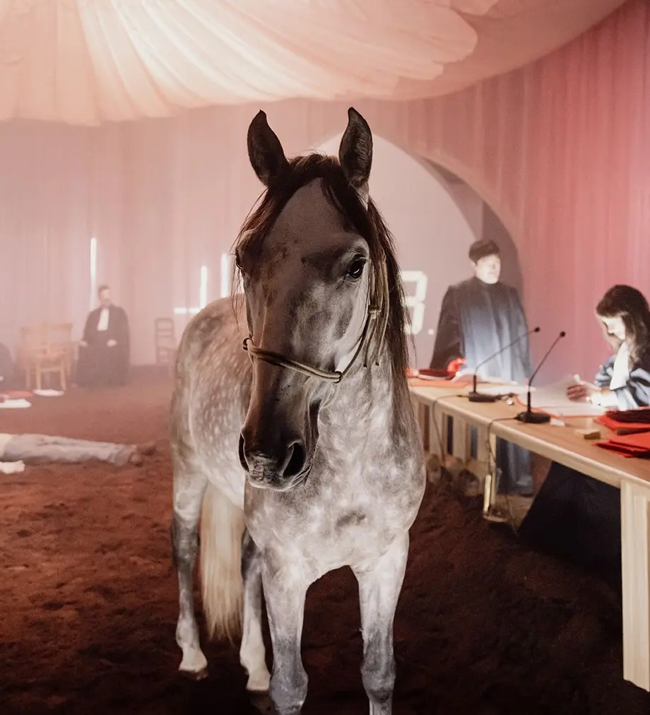 Sur un texte de Guillaume Poix, Lorraine de Sagazan, metteure en scène et plasticienne, s’inspire des pratiques de la justice dite transformatrice pour proposer une alternative au schéma traditionnel juger-punir-enfermer. Dans un tribunal aux allures de chapiteau forain, trois jugements inspirés de faits réels seront rendus, accompagnés par un témoin lui aussi repris de justice. Mais ici, le décalage opéré dans l’interprétation des comédiens et dans les masques qui les griment, allant jusqu’à l’irruption d’un cheval, seul symbole de douceur et de sérénité, donne toute sa force au spectacle. Une expérience visuelle et théâtrale intense dont on garde la trace longtemps !