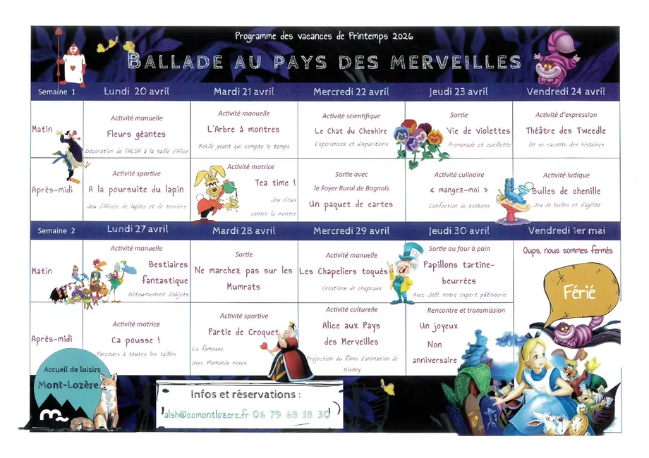Le Centre de loisirs du Bleymard vous présente son programme des vacances de printemps 2026 sur le thème « Balade au pays des merveilles ». Inscription possible à la journée ou à la demi-journée.