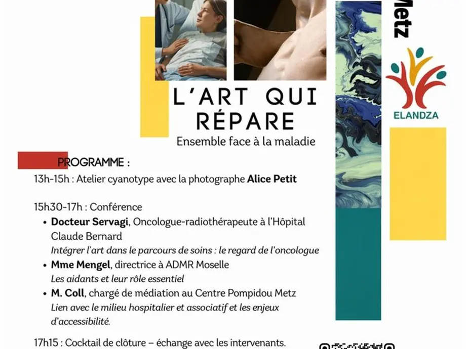 Une oncologue, Dr Servagi, la directrice de l'ADMR Moselle, Mme Mengel, et un chargé de médiation du Centre Pompidou-Metz, M. Coll, parleront de l'art et de la culture dans le parcours de soins, du rôle des aidants et des enjeux d'accessibilité.