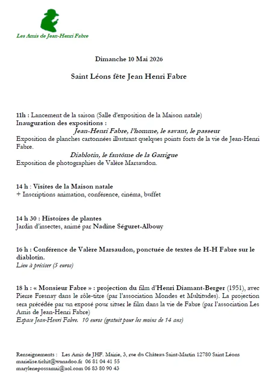 16 h : Conférence de Valère Marsaudon, ponctuée de textes de J.-H. Fabre sur le diablotin. Lieu à préciser (5 euros).
