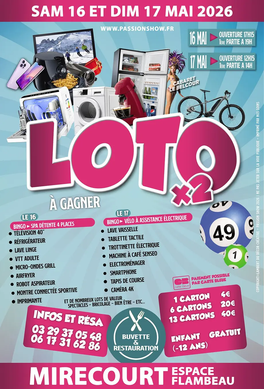 "Les 16 et 17 mai, Passion Show organise 2 super Lotos dont les bénéfices seront entièrement investis dans la 9ème édition du GRAND-SHOW – SPECTACLE DE VARIÉTÉS ET SCÈNE OUVERTE le samedi 3 octobre 2026 à Mirecourt. Nous comptons vivement sur vous, pour vous faire plaisir tout en contribuant ainsi à la réalisation d'un spectacle de variétés de haute tenue.