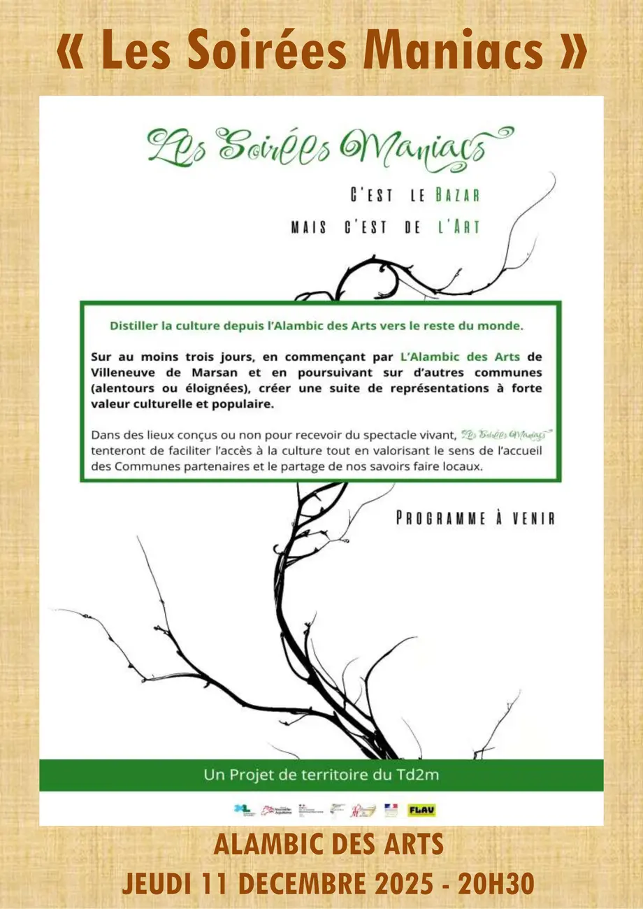 Sur au moins 3 jours, en commençant par l'Alambic des Arts de Villeneuve-de-Marsan et en poursuivant sur d'autres communes (alentours ou éloignées), créer une suite de représentations à forte valeur culturelle et populaire.