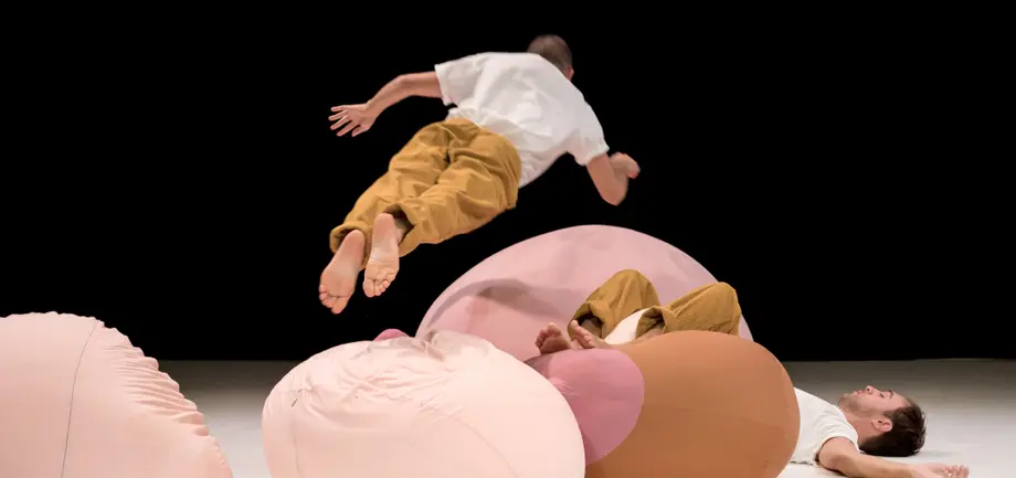 Deux danseurs, deux corps, une pile de coussins, une sculpture textile : le décor est posé, l’univers s’ouvre. Les corps se mettent en mouvement, les coussins dansent, se transforment… et la poésie commence.