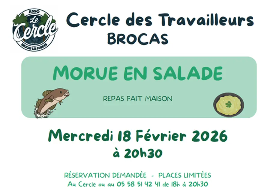 Ce 18/02/2026, mercredi des Cendres, nous célébrerons la Fête de la Morue au Cercle de Brocas. Ce poisson vertueux, qui possède de nombreux atouts alimentaires, ne manquera pas de satisfaire vos papilles gustatives dans une ambiance chaleureuse et conviviale. Mais pour cela, inscrivez-vous rapidement, car les places sont limitées.