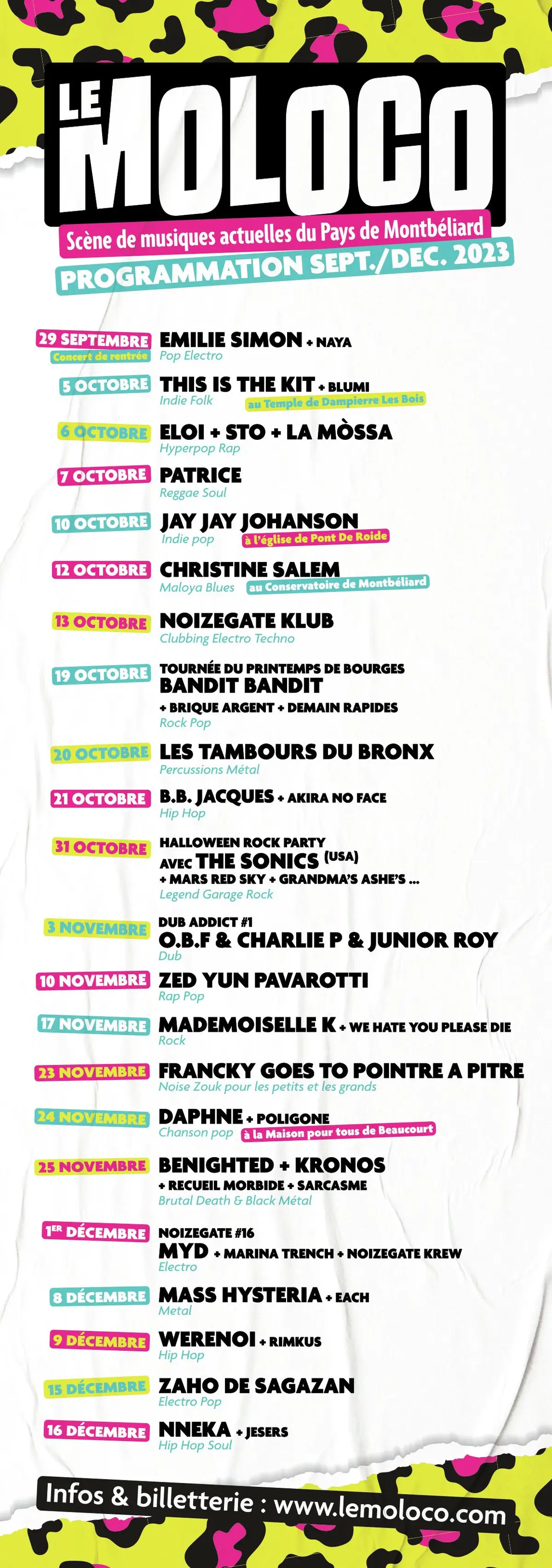 Le Moloco à Audincourt, juste à côté de Montbéliard, attire environ 20% de Haut-Rhinois chaque année, grâce à une programmation bien sentie et qui fait régulièrement venir des artistes ou groupes rares, mais très réputés parmi les mélomanes curieux ! « Notre vocation première, c’est la diversité, avec trois grands axes musicaux : la musique indé/pop, les nouvelles esthétiques hip-hop et electro, et ce qui fait l’ADN de la salle depuis sa création il y a plus de dix ans, les musiques extrêmes ! », signale Matthieu Spiegel, le nouveau directeur programmateur de la salle, un ancien du Nouma’ à Mulhouse. « La prog’ est un bel équilibre de têtes d’affiche et de talents locaux. Je suis ravi d’avoir The Sonics, des légendes du rock qui ont inspiré bien des groupes comme White Stripes. On aura aussi Zaho de Sagazan, qui commence à cartonner ou Werenoi, qui marche super bien chez les jeunes ».