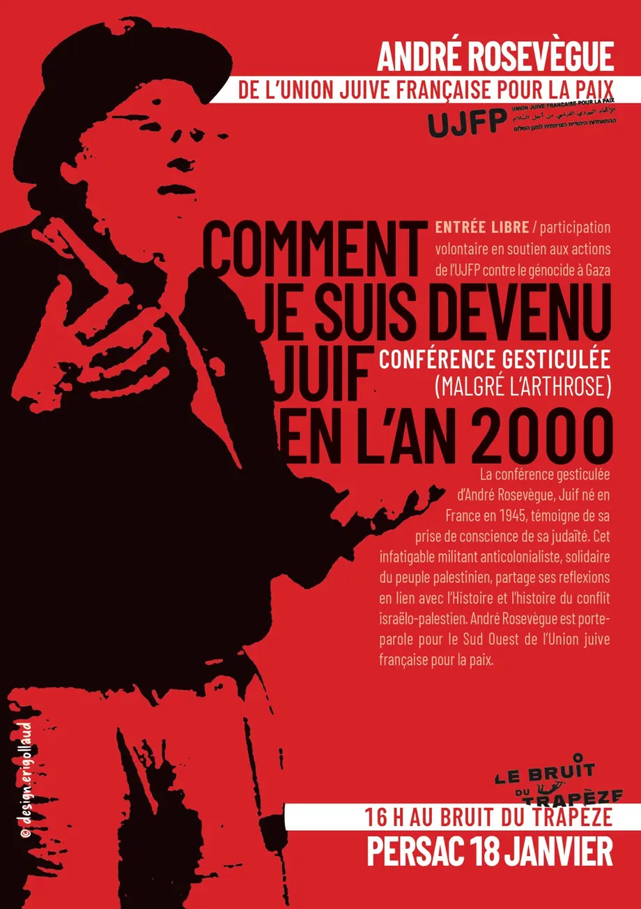 La conférence gesticulée d’André Rosevègue, Juif né en France en 1945, porte-parole pour le Sud-Ouest de l’Union Juive Pour la Paix (UJFP) et infatigable militant anticolonialiste, témoigne de sa prise de conscience de sa judaïté en lien avec l’Histoire et l’histoire du conflit israélo-palestinien… suivie d’un débat et d’un moment convivial.